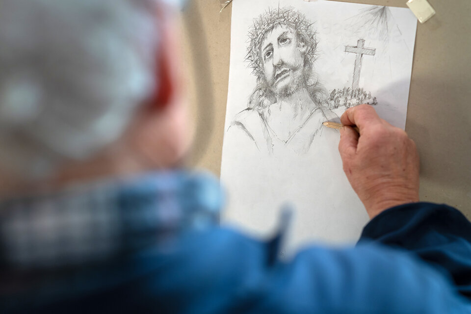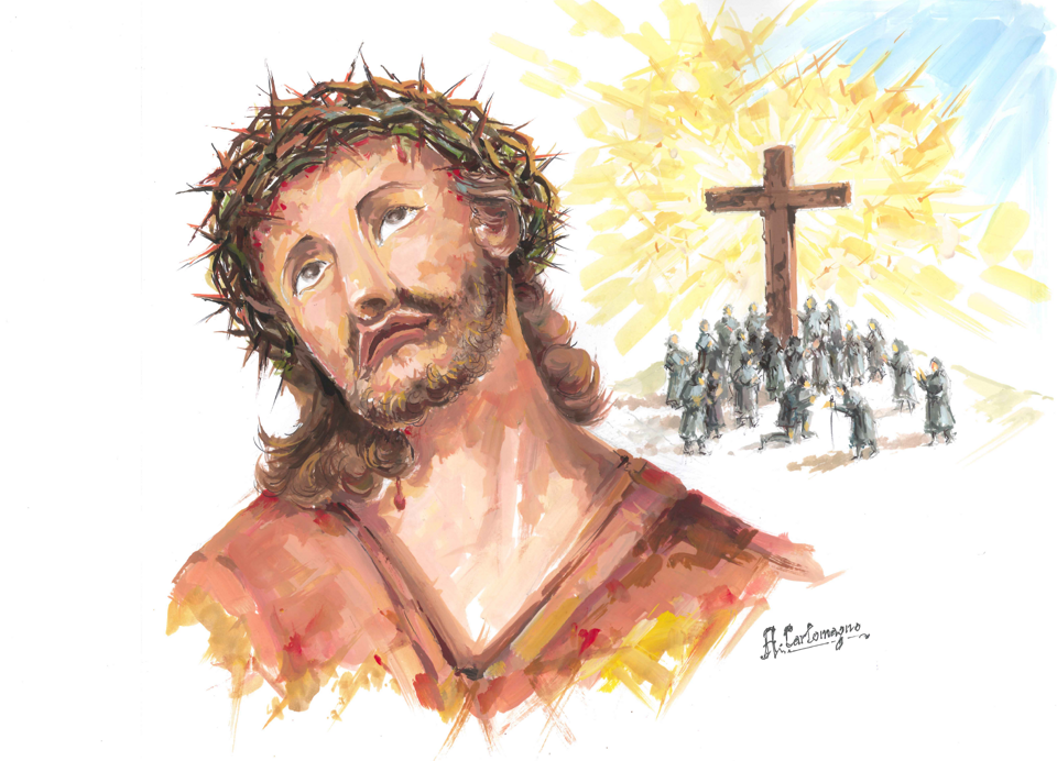 La sofferenza e il dolore appartengono alla parabola della vita terrena, ciò è condensato nella sofferenza epocale di Gesù Cristo che la vive nei terribili quattordici momenti della Via Crucis. Nel dipinto, il primo piano del suo volto definisce uno stato fisico e morale finale, ma gli occhi sono rivolti verso un infinito dove la luce intensa della Croce proietta una nuova speranza per l'umanità. I fedeli posti in maniera circolare orano e condividono intensamente il grande dolore.