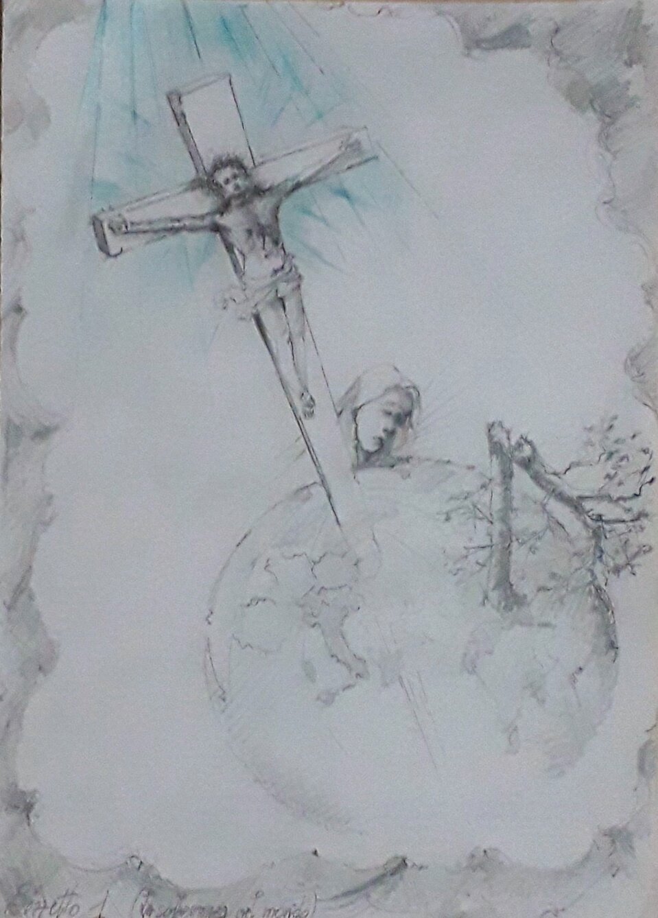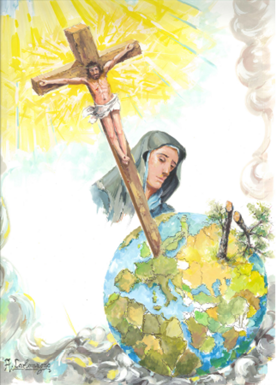 La croce di Cristo piantata sul mondo è simbolo di sofferenza. La Madonna, mamma triste e carica di dolore, prostrata osserva lo sfacelo di una natura che si ribella: l'albero spezzato.
